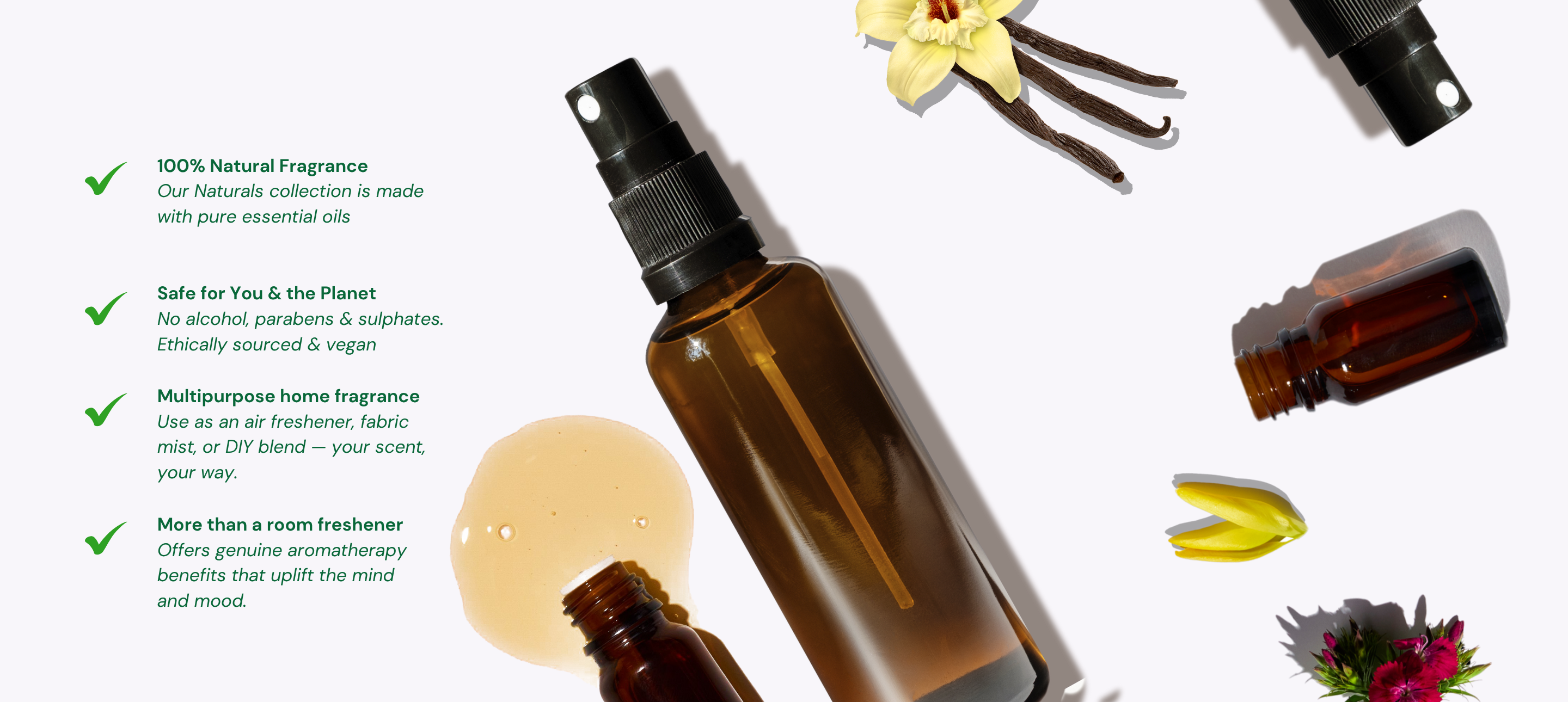 Aromafume’s 100% Naturals Collection is crafted from pure plant extracts—leaves, flowers, woods, and roots—bottling nature’s vitality in every drop and mist.