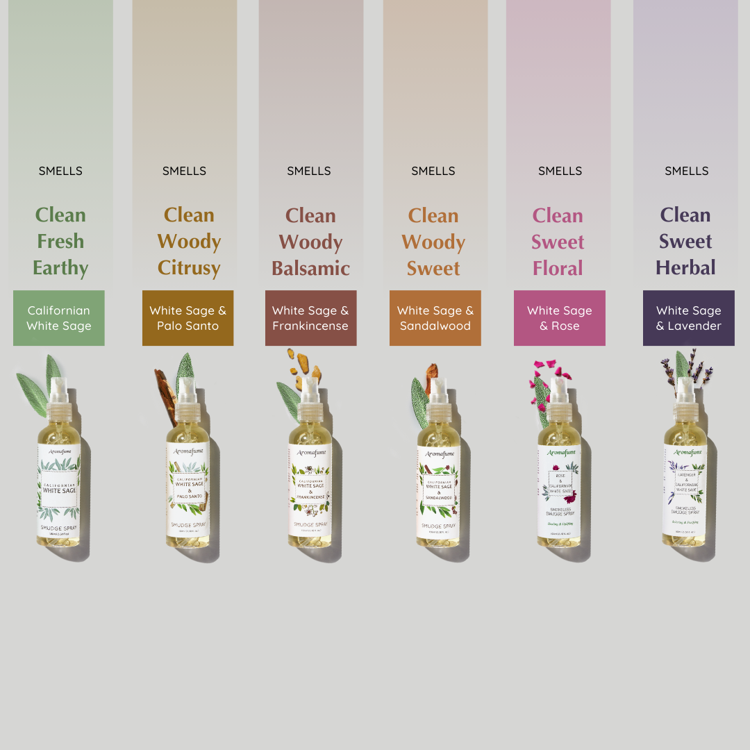 Smokeless Smudging | Natural Home Fragrance & Aromatherapy Spray | Assortment scents with White Sage combined with Palo Santo, Rose, Frankincense, Sandalwood & Lavender