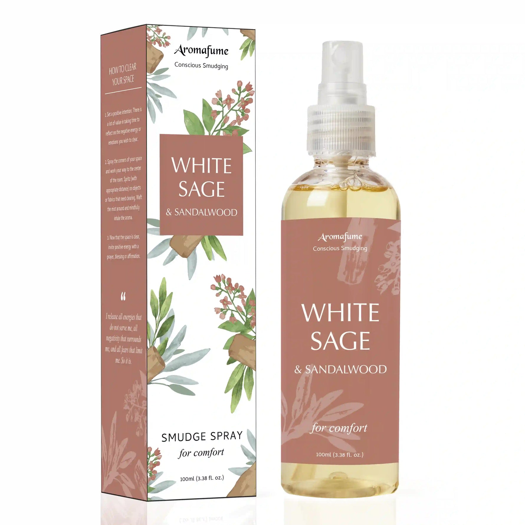 Aromafume's White Sage & Sandalwood Smudge Spray is a unique blend that harnesses healing and mystical properties of both combined. In addition to their pleasant fragrance, the combination of White Sage and Sandalwood offers additional benefits, such as calming anxiety and enhancing mental well-being and overall wellness.