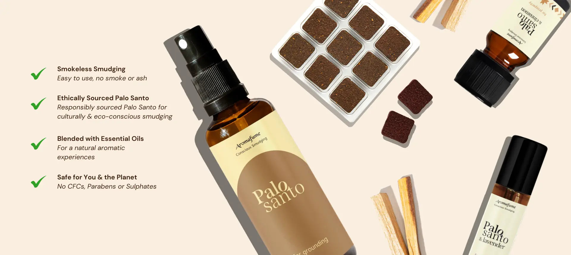 Honoring this ancient tradition sustainably, Aromafume offers a mindful alternative, incense bricks. Meaning “holy wood” in Spanish, Palo Santo is cherished for its sacred, healing, and therapeutic properties.