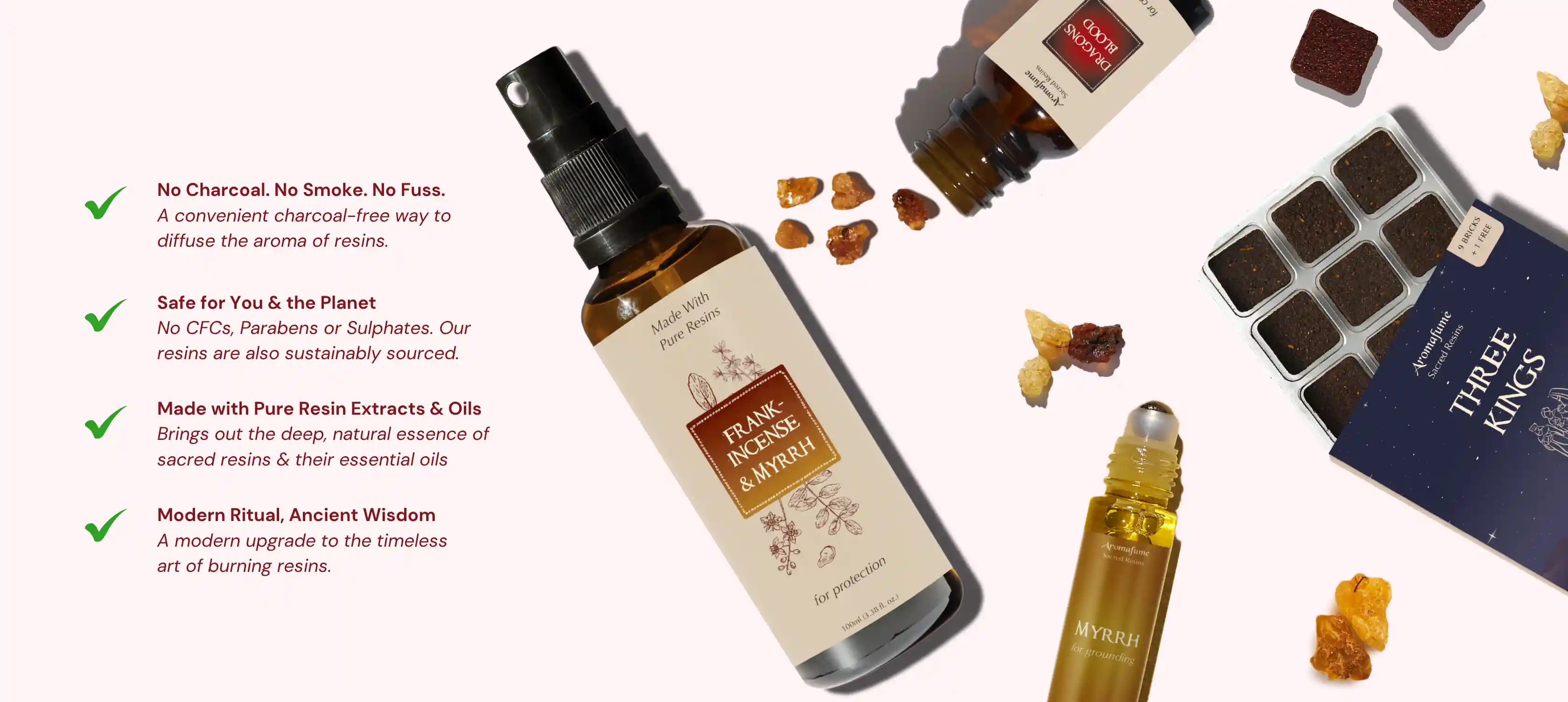 Aromafume’s Resin Collection brings the sacred essence of Copal, Frankincense, Myrrh, Benzoin, Three Kings and Dragon’s Blood into your daily rituals in a modern, convenient form. Each fragrance is crafted to cleanse negative energy, promote positivity, and awaken a sense of clarity, balance, and connection to higher consciousness.