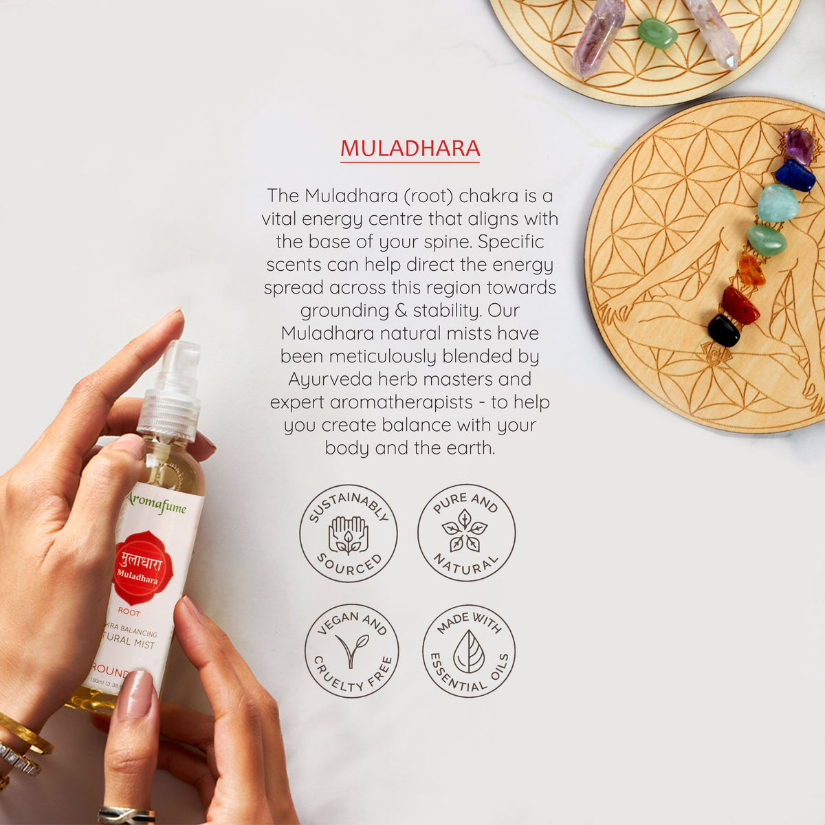 Muldhara (Root Chakra) Natural Mist are skillfully crafted by a Chakra Alignment Herb Master, featuring a well-balanced fragrance from pure aromatic extracts. The scent helps dispel darkness, anxiety, and vulnerability, fostering feelings of safety, security, and courage. It encourages a stronger connection to the body and the Earth, aiding in a sense of grounding and stability.
