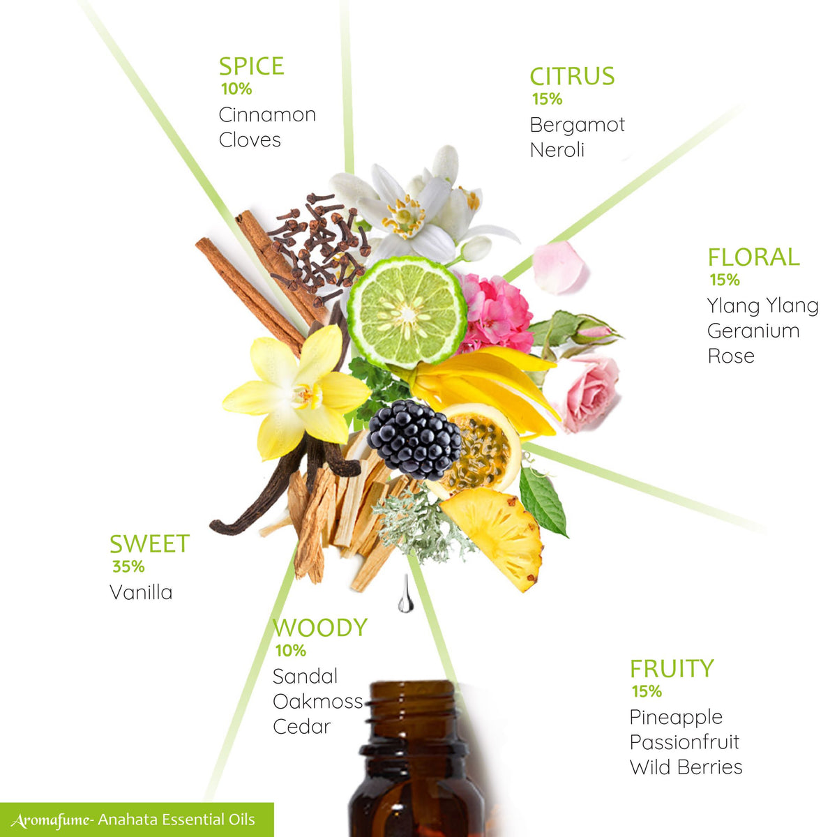 Citrus Bergamia, Citrus Aurantium Amara, Cananga Odorata, Pelargonium, Ananas Comosus, Passiflora Edulis, Syzygium Aromaticum, Cinnamomum Verum, Vanilla Planifolia, Cedrus Deodara, Evernia Prunastri, Caprylic Capric Triglyceride, Fractionated Coconut Oil, Natural Emollients