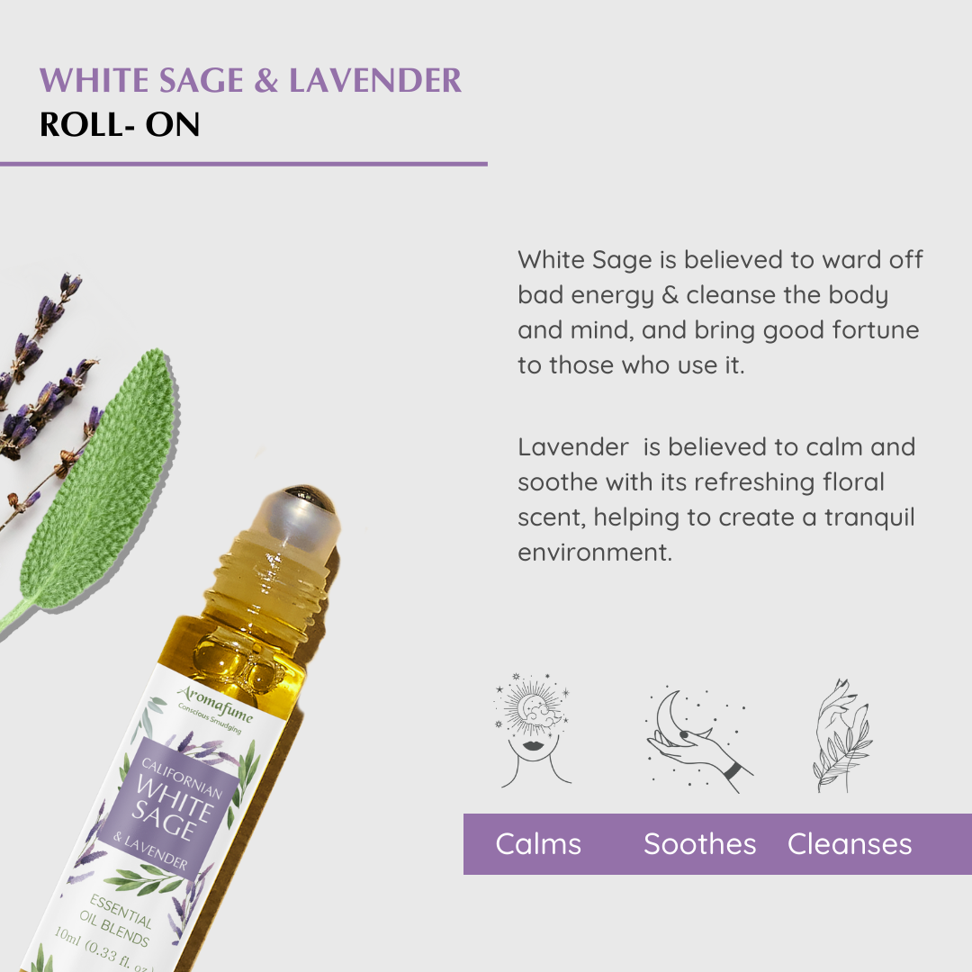 Aromafume's White Sage & Lavender Essential Oil Roll-On create a powerful combination that offers purification and a soothing, calming effect. The roll-on consists of natural Sage extracts and Lavender, promoting deep relaxation, cleansing, and the generation of positive energy.