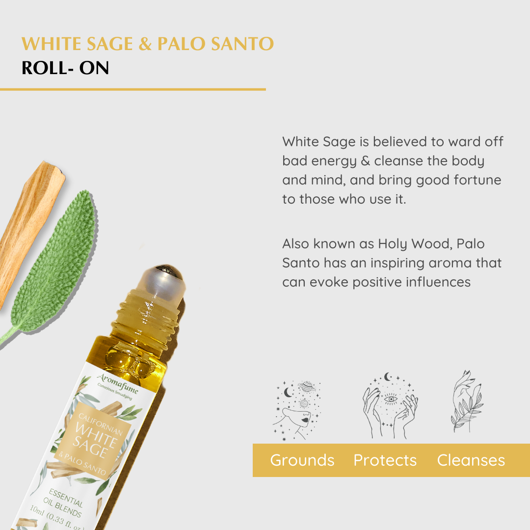 Aromafume's White Sage & Palo Santo Essential Oil Roll-On incorporate natural extracts from Sage, along with Palo Santo. This distinctive blend is formulated to promote feelings of positivity, serenity, self-assurance, and tranquility. White Sage has a historical association with connecting to the spiritual world and enhancing intuition, and when combined with Palo Santo, it effectively amplifies its ability to repel negative energies.