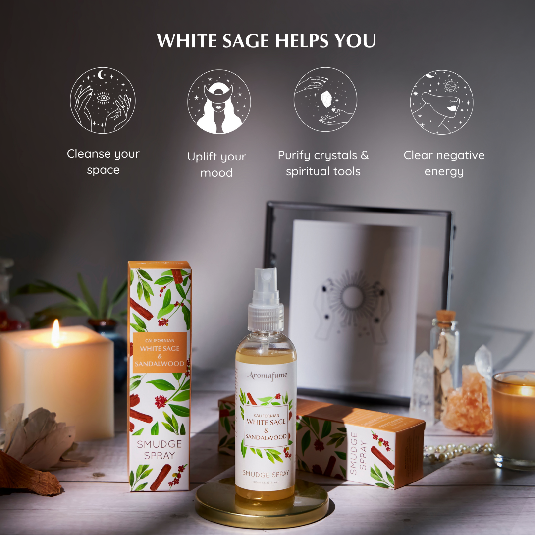 Aromafume's White Sage & Sandalwood Smudge Spray is a unique blend that harnesses healing and mystical properties of both combined. In addition to their pleasant fragrance, the combination of White Sage and Sandalwood offers additional benefits, such as calming anxiety and enhancing mental well-being and overall wellness.