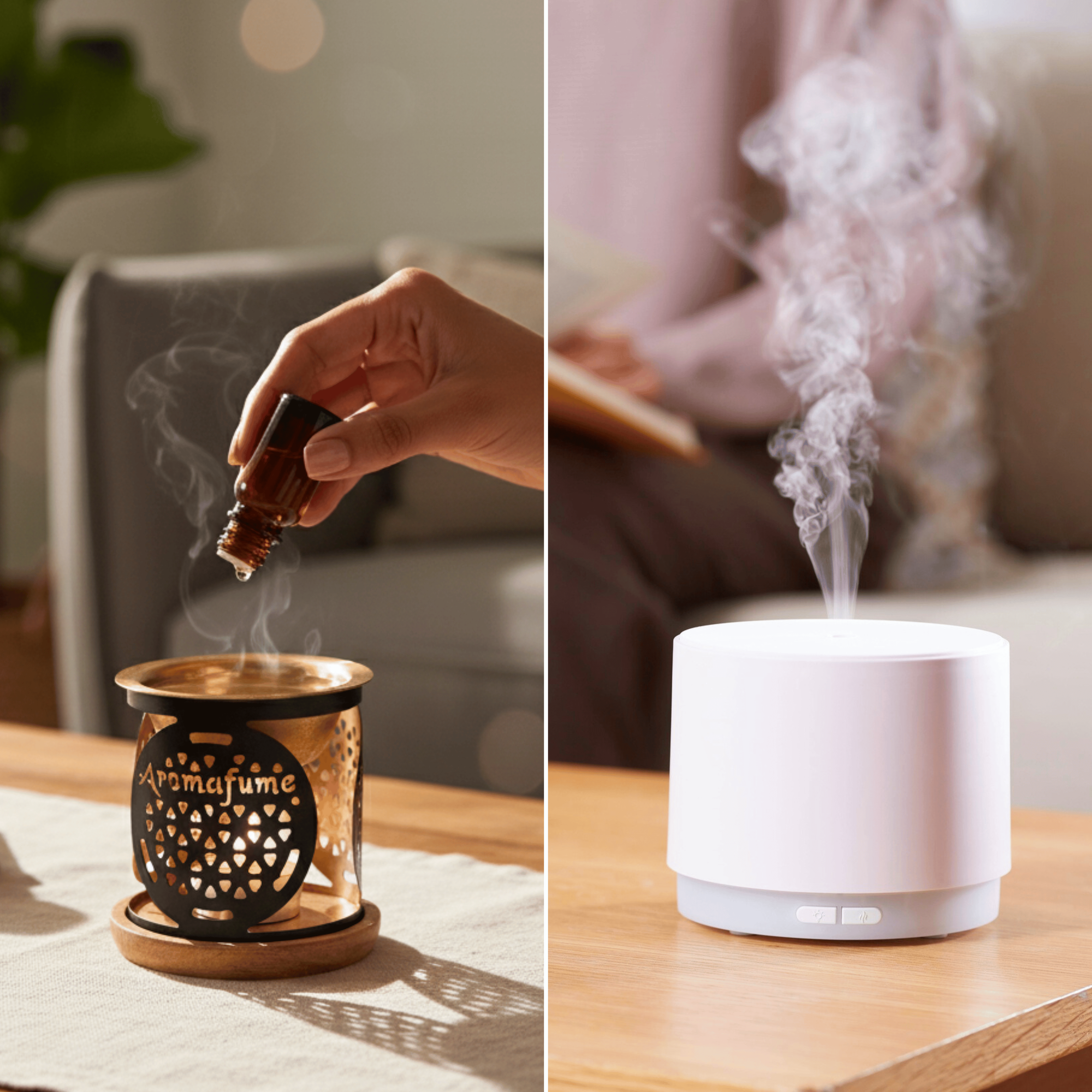 Use an electric diffuser for larger spaces and a candle diffuser for smaller rooms or enclosed areas. Always add water before the oil to ensure safe, even diffusion.